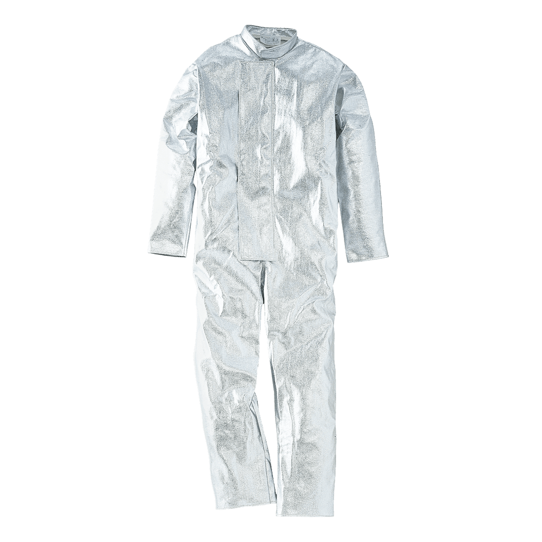 Magas mechanikai védelmi, és hőálló képességgel rendelkező, alumíniumizált para-aramid szálból készült overál, mandarin gallérral, rejtett gombolású, tépőzáras zárással.