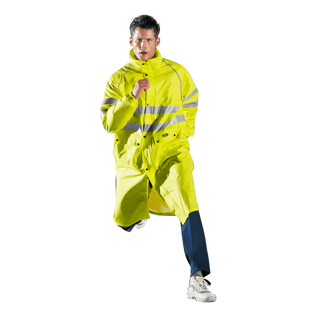 Láthatósági kabát rejtett cipzárral és gombokkal; feltekerhető kapucnival; rugalmas, szélálló mandzsettákkal; gombokkal záródó, vízálló zsebekkel; fényvisszaverő csíkok a mellkason.