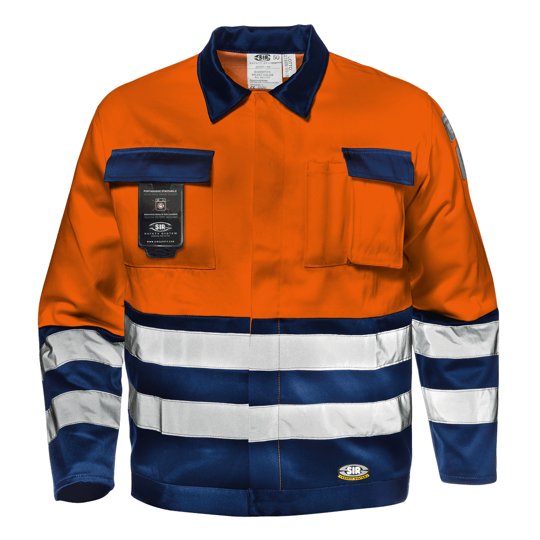 Láthatósági kabát 60% pamutból és 40% poliészterből (350 g/m²); ingnyakkal; rejtett gombolással; háromdimenziós, fedett, tépőzáras mellzsebbel; 2 darab tollzsebbel; fényvisszaverő csíkkal a mellkason és az ujjakon.