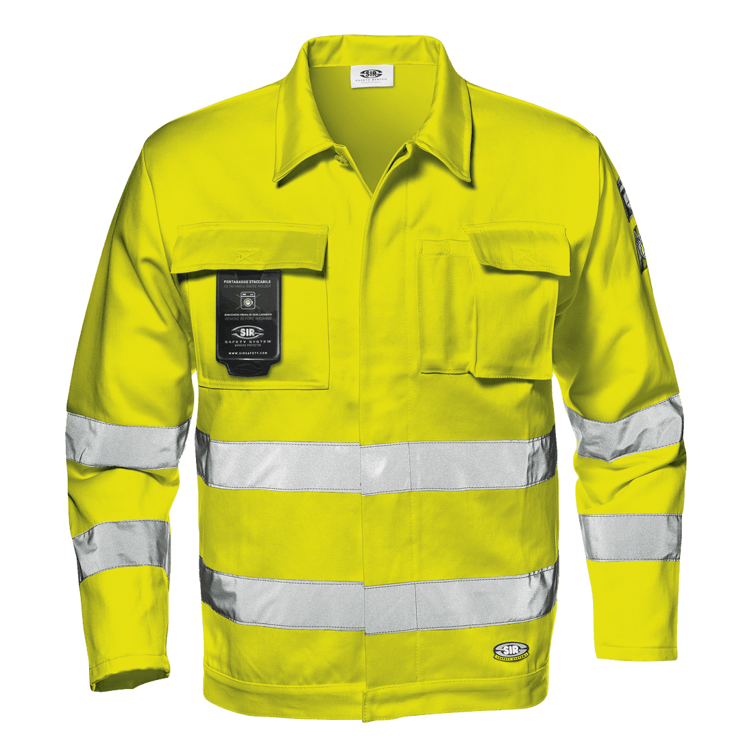 Láthatósági kabát 60% pamutból és 40% poliészterből (350 g/m²); ingnyakkal; rejtett cipzárral; fedett, tépőzáras mellzsebekkel; tollzsebbel és belépőkártya tartóval; dupla fényvisszaverő csíkkal a mellkason és az ujjakon.