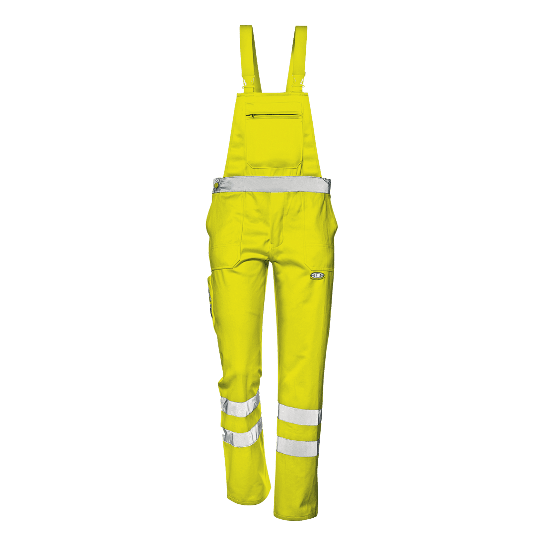 Láthatósági nadrág 60% pamutból és 40% poliészterből (350 g/m²). Rugalmas vállpántok, gyorscsatokkal; rejtett cipzáras mellzseb; gombbal állítható derékrész; jobb oldalon mérőszalag tartó zseb; két oldalsó és hátsó zseb.