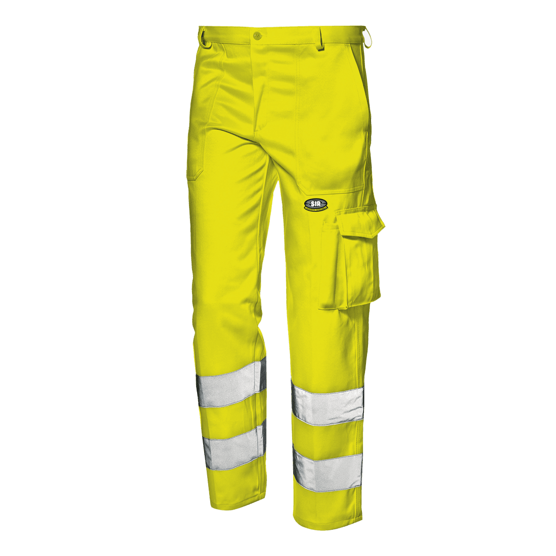 Láthatósági nadrág 60% pamutból és 40% poliészterből (350 g/m²). Gombos és cipzáras; két darab ferde zseb; háromdimenziós, fedett, tépőzáras oldalzseb, tollzsebbel. Jobb lábszáron mérőszalag tartó zseb. Fedett, gombos farzseb.