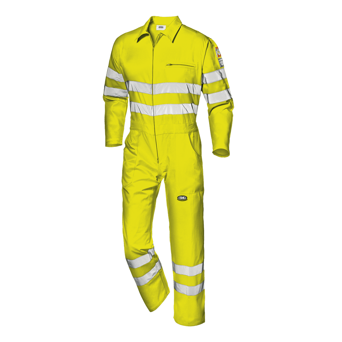 Láthatósági overál 55% pamutból és 45% poliészterből (240 g/m²); ingnyakkal; kétutas, rejtett cipzárral; cipzáras mellzsebbel; rugalmas derékrésszel; fényvisszaverő csíkkal a mellkason és az ujjakon.