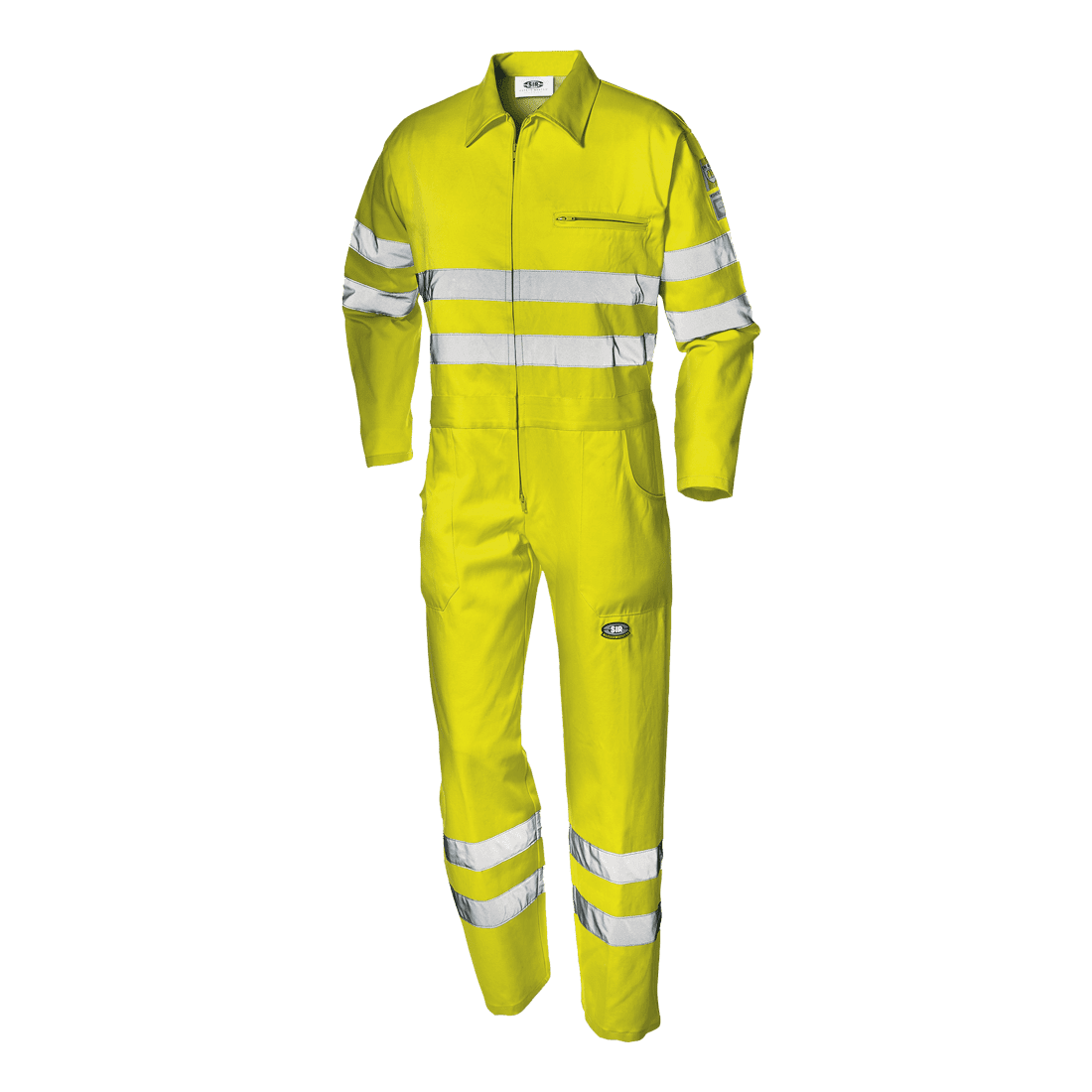 Láthatósági nadrág 60% pamutból és 40% poliészterből (350 g/m²). Ingnyakkal; rejtett, kétutas cipzárral; jobb oldalon mérőszalag-zsebbel; két nagyméretű nadrág-zsebbel; cipzáras mellzsebbel; rugalmas derékrész. Dupla varrás biztosítja a ruha tartósságát.