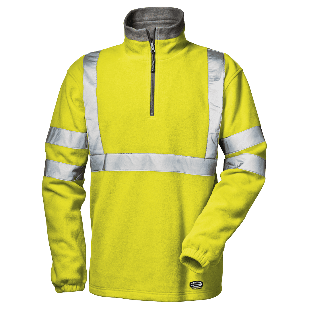 Láthatósági pulóver 100% poliészter gyapjúból (320 g/m²), magasított nyakkal, cipzárral és rugalmas mandzsettákkal, fényvisszaverő csíkkal a mellkason, a vállakon és az ujjakon.