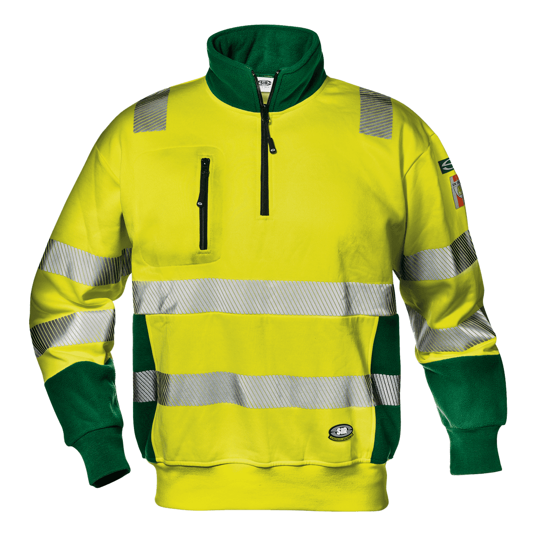 Láthatósági pulóver 65% pamutból és 35% poliészterből (320 g/m²), magasított nyakkal, cipzárral, rugalmas mandzsettákkal és derékrésszel, fényvisszaverő csíkkal a mellkason és az ujjakon, cipzáras külső mellzsebbel.