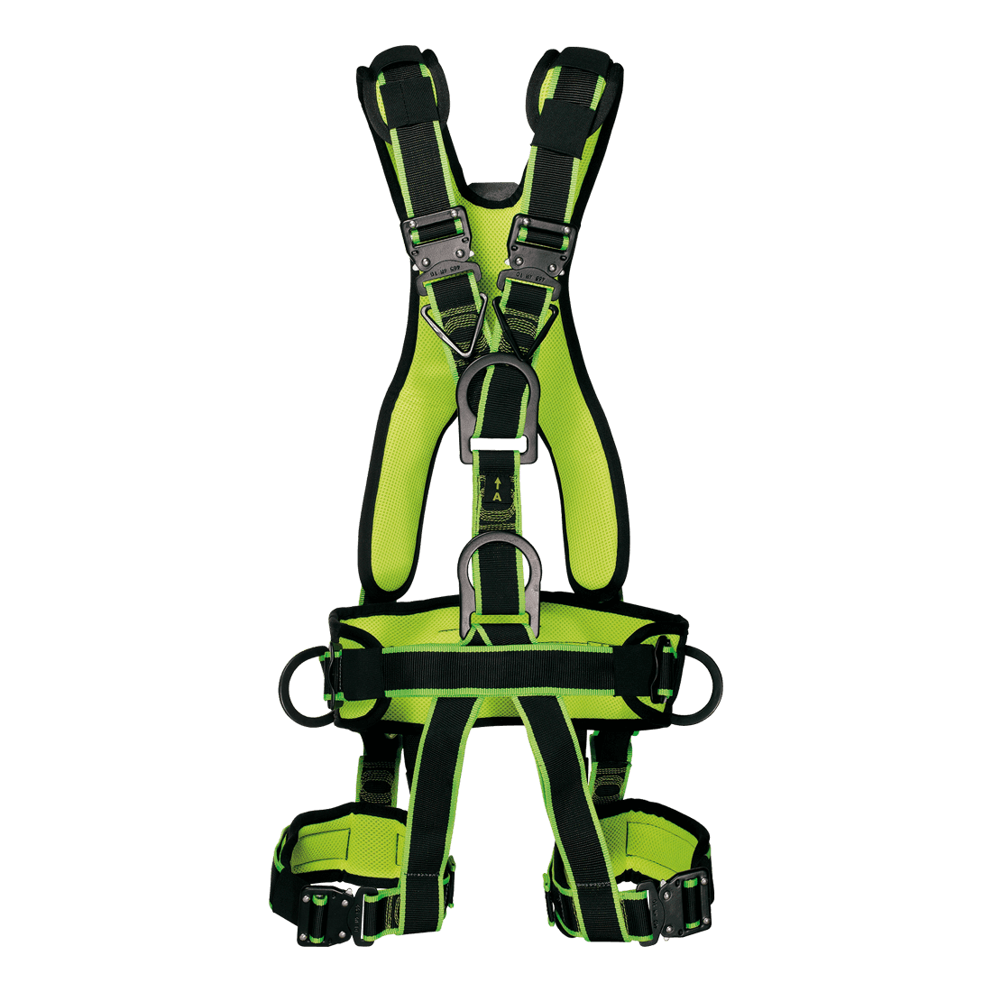 Állítható mellkasi pánt és lábpántok, valamint állítható deréköv. Ülőpánt a kényelmes munkavégzéshez. Párnázott váll-, derék- és lábpántok a nagyobb kényelemért. A lábpántok gyorscsatokkal vannak ellátva. Egy kézzel is könnyen állítható pántok.