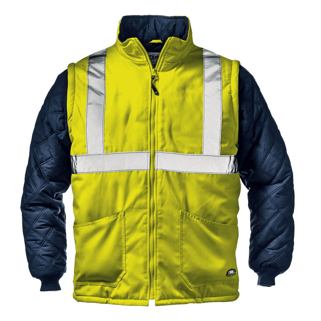 Szennyeződés-taszító anyagú, láthatósági dzseki. Patentos zsebek, egy cipzáras mellzseb.