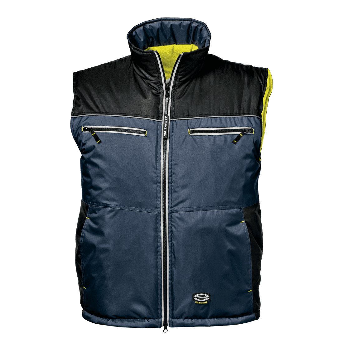A kék oldalon cipzáras mellzsebek, fényvisszaverő csíkok a mellkason.