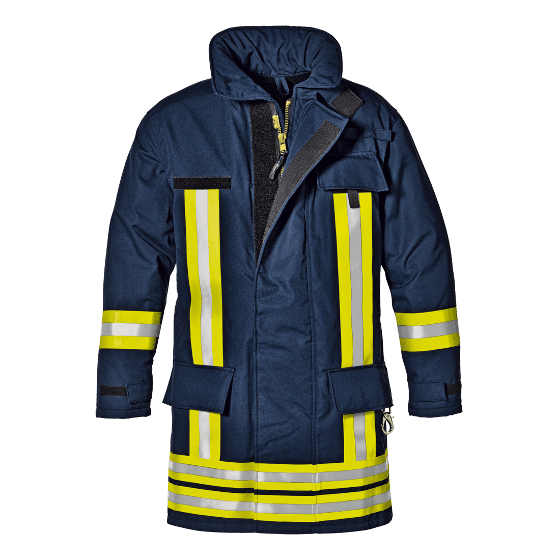 Négy rétegű aramid anyagból. Tépőzáras fedő alá rejtett biztonsági cipzár; tépőzáras gallér; tépőzáras belső zseb; fedett, tépőzáras oldalzsebek; fedett, tépőzáras mellzseb; az oldalzseben szerszámtartó karabiner; állítható mandzsetta méret; fényvisszaverő csíkok a mellkason, az ujjakon és a kabát alján.